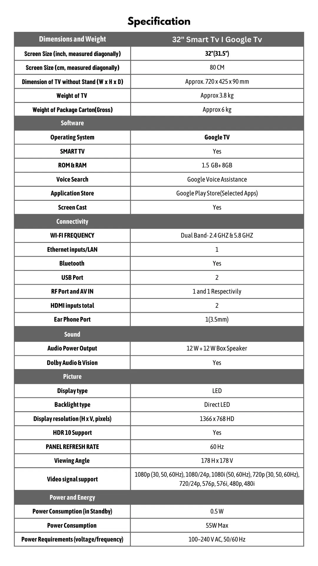 HDR 10 I Dolby Vision I Dolby Atoms Google Tv Dual Wifi- 2.4 GHz & 5.8 GHz Google Voice Assistance Voice Command Remote Google App Store 24W Box Speakers 2 USB, 2HDMI, Ear Phone Port