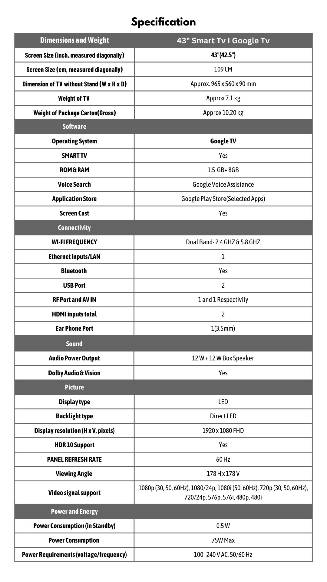 HDR 10 I Dolby Vision I Dolby Atoms Google Tv Dual Wifi- 2.4 GHz & 5.8 GHz Google Voice Assistance Voice Command Remote Google App Store 24W Box Speakers 2 USB, 2HDMI, Ear Phone Port
