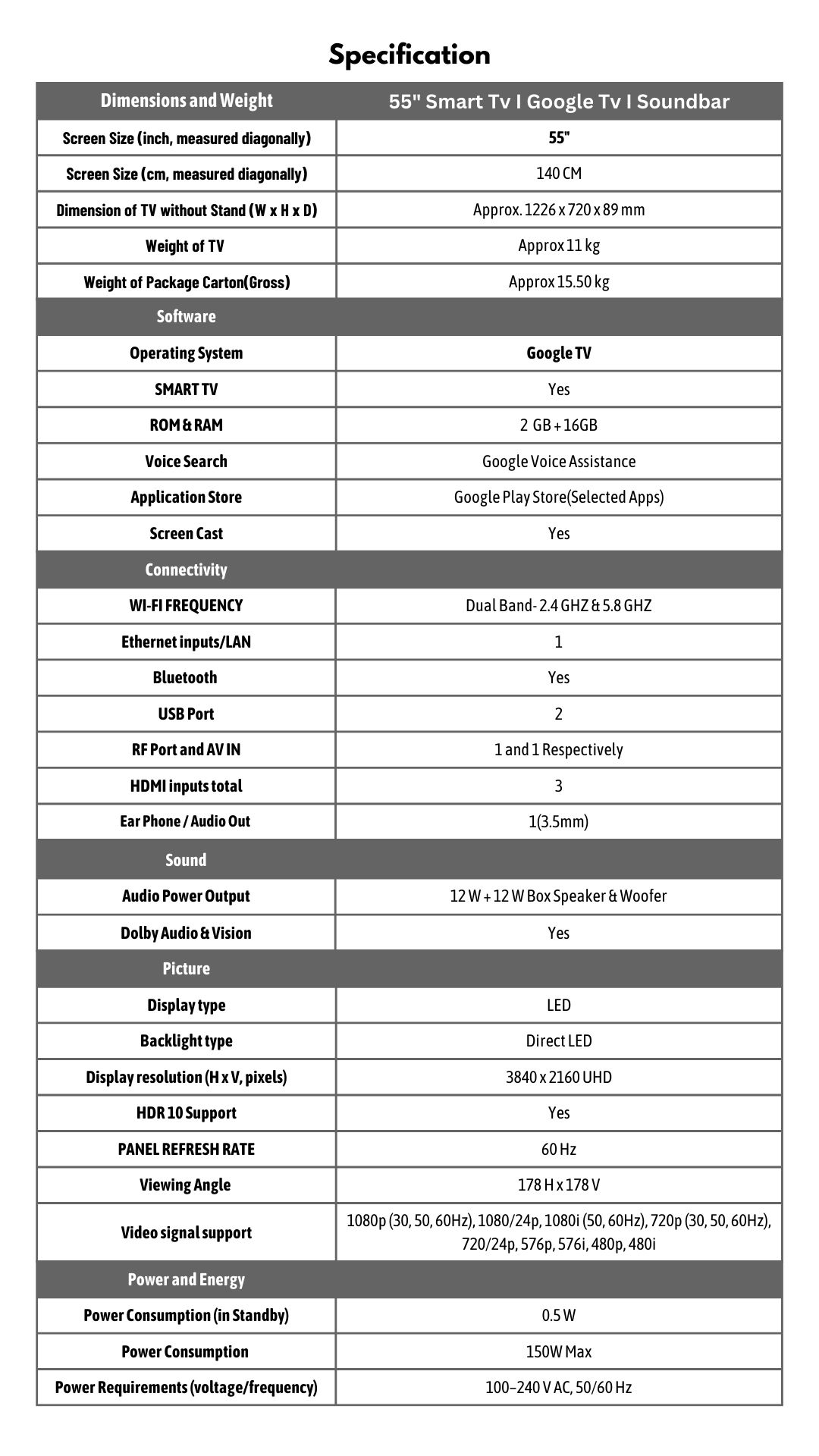 HDR 10 I Dolby Vision I Dolby Atoms Google Tv Dual Wifi- 2.4 GHz & 5.8 GHz Google Voice Assistance Voice Command Remote Google App Store Woofer 24W Box Speakers 2 USB, 3HDMI Ear Phone Port
